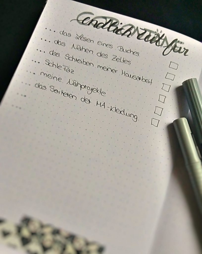 Ich persönlich bin ein großer Freund des Bullet Journalings. Ohne meinen kleinen Helfer ginge in meinem Leben gar nichts. Und gerade für die jetzige Situation ist mein kleiner Freund der Helfer in der Not. Jeden Abend lege ich mir meine To-do’s und Ziele für den nächsten Tag fest und seien sie noch so klein. Wenn ich sonst fast eine Seite pro Tag an To-do’s erledigen musste, sind es jetzt weniger. Die Hauptsache ist, dass ich was zu tun habe. Übrigens steht jetzt in meiner To-do-Liste auch so etwas wie Serie schauen, warum auch nicht, ich habe Zeit 🙂