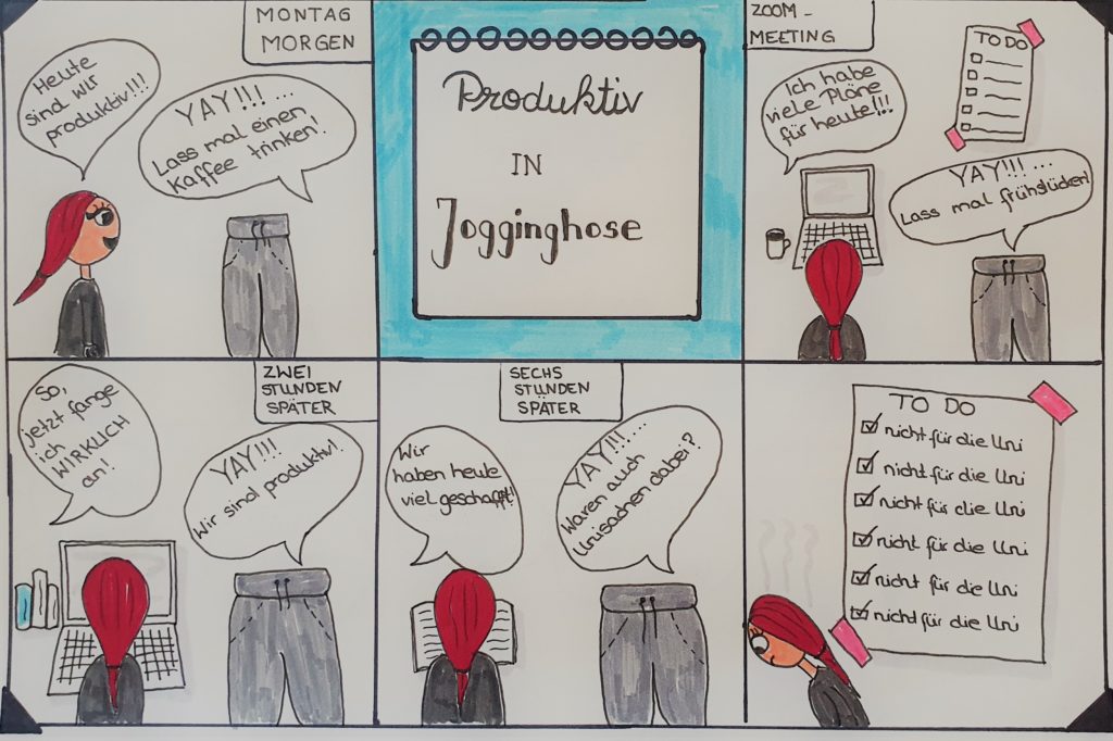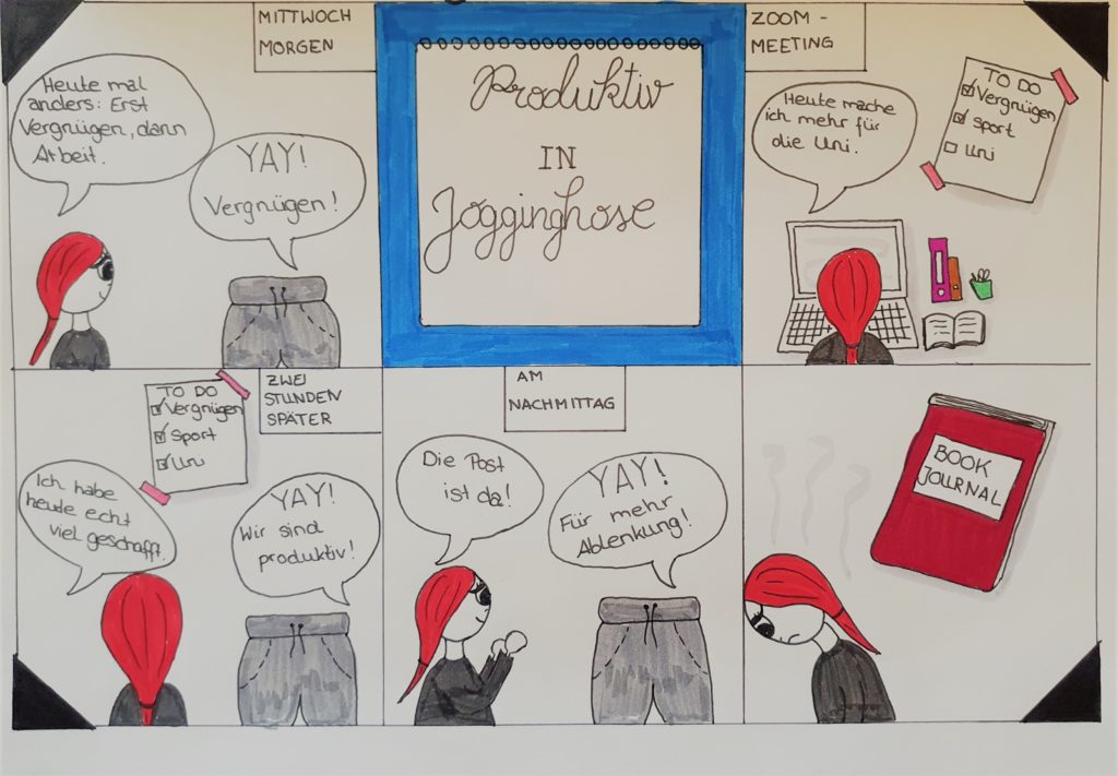 Mir geht es bei diesem Projekt einzig um meinen Arbeitsprozess und nicht darum, meine Noten zu verbessern. Ich fing also an, mir zu überlegen, warum ich zu Hause nicht so gut arbeiten kann wie in der Bibliothek. Zum einen ist da die Verlockung, einfach im Bett liegen zu bleiben und den ganzen Tag Serien zu schauen. Aber das allein schien mir nicht das Problem zu sein. Denn auch alle Ablenkung verliert irgendwann ihren Reiz. Und trotzdem konnte ich mich nicht aufraffen. Ich saß am Schreibtisch vor meinen Uni-Unterlagen und starrte sie einfach nur an, in der irrwitzigen Hoffnung, dass sich die Arbeit doch vielleicht von selbst erledigt. (Tat sie natürlich nicht, wäre ja auch zu schön gewesen) Daraufhin überlegte ich mir, was anders ist. Welches Gefühl hatte ich beim Lernen in der Uni? Und welches Gefühl habe ich zu Hause? Und dann wurde mir klar, dass das Lernen in der Uni für mich gleichzusetzen ist mit dem Gefühl, wenn ich zur Arbeit gehe. Und eine Sache trage ich nie bei der Arbeit und das ist meine Jogginghose. So blöd das auch klingen mag, aber diese Jogginghose verhinderte bei mir, dass sich eine Arbeitshaltung entwickelte. Die einfache Lösung wäre gewesen, mir morgens eine Jeans anzuziehen. Aber das war nicht mein Ziel. Ich hatte ja den Plan, an meinem Prozess und meiner Einstellung zu arbeiten. Und somit versuche ich jetzt seit 2 Wochen, meine Jogginghose in eine Arbeitsjogginghose zu verwandeln – eine Achterbahn der Gefühle und Produktivität, um es vorwegzunehmen.